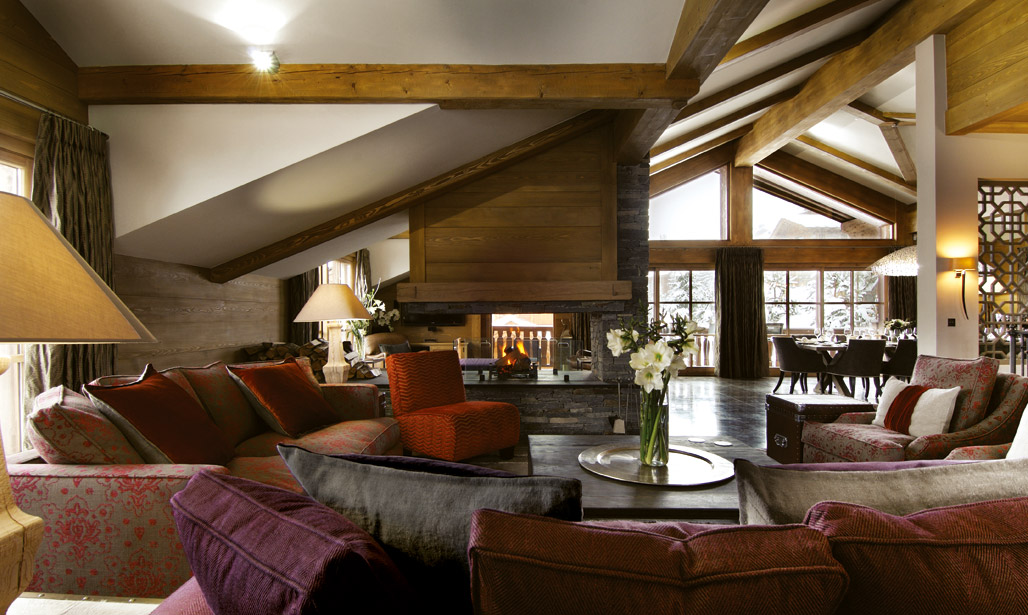 This luxury chalet is built over five floors with the fifth floor having been sensibly retained for the communal areas – it has the best views. Think Heidi-style wooden, pitch-roofed hut but palatial: the first floor includes a heated pool, steam room and jacuzzi; the second a ski room and garage; third and fourth floors hold the bedrooms. There are six of these, all en-suite and all, bar one, with bath and shower. Throughout, pale wood has been tastefully paired with stone and marbled floors, and decor is generally muted. Until one gets to the bedrooms, which are rich, plush and inviting.