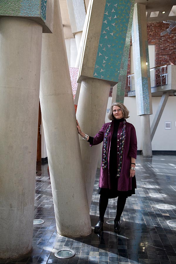 The double-volume foyer of the main court building, with its angled mosaic columns representing tree trunks and the holes in the concrete roof slab simulating light falling through branches and leaves, sets the tone for a user-friendly building that incorporates artworks by various artists and craftspeople. It is filled with symbolism and the past is revealed through devices such as the use of red brick from the demolished awaiting-trail building in the interior of the court room, thus creating a site of living memory.
