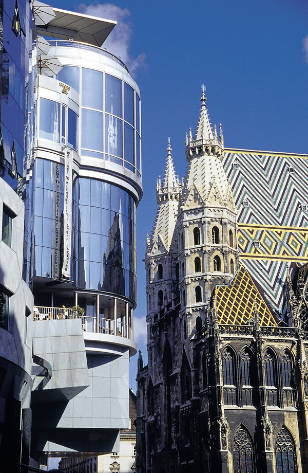 The cathedral’s mosaic roof and soaring spire are reflected in the cantilevered glass facade of Haas Haus designed by Hans Hollein, one of Europe’s foremost architects. In true Viennese fashion, its construction within the Innere Stadt – a UNESCO World Heritage Site – was met with controversy but once the media frenzy had died down it soon became another source of architectural pride.