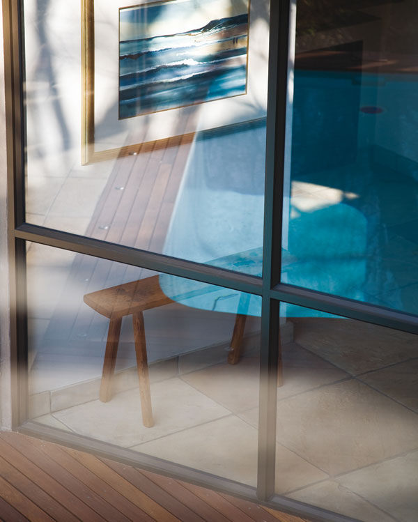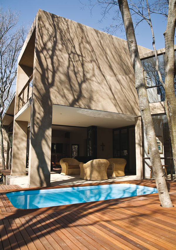 Two white stinkwoods form a canopy overhead, creating a tree-house effect in the main bedroom. The plunge pool, sunken into the deck between Elgru’s workroom and the living room, offers a welcome, cool oasis.
