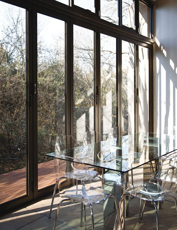 The house is both surrounded by, and contains, nature’s works of art, each floor-to-ceiling window framing a tree-top or gnarled trunk as a focal point.