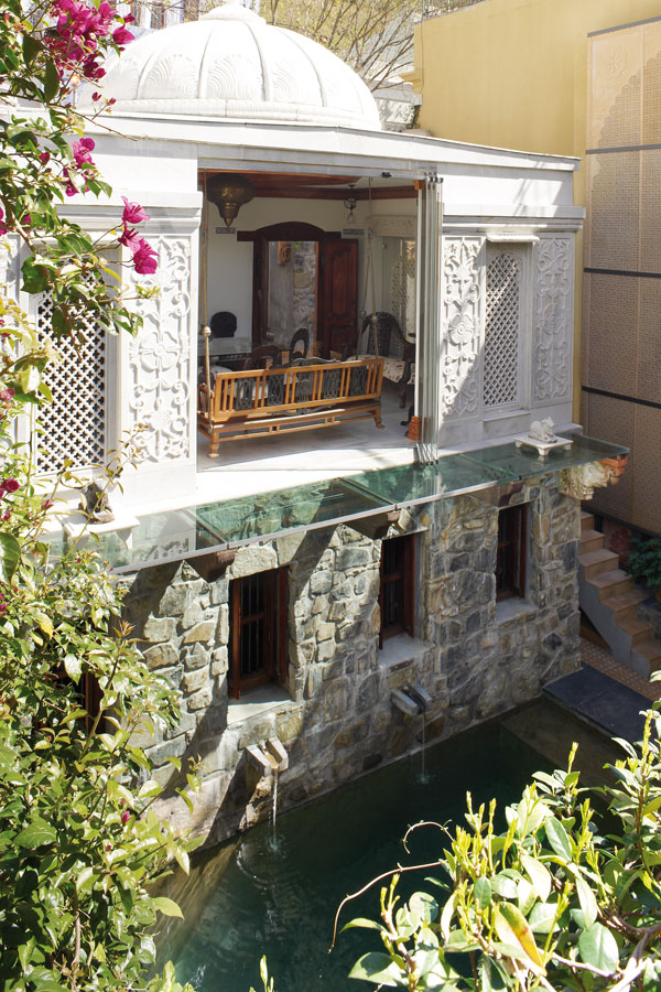 For the cool, private courtyard, for example, they ordered a marble teahouse with a magnificent dome. It took 60 craftsmen 22 months to carve it by hand in the scorching Thar Desert and the cupola alone weighs in at 13 tons. In Udaipur, they saw an impressive crystal chandelier and borrowed 20 individual pieces from the owners (an aristocratic family) to have their own made by hand. (They thanked the family by replacing a few of the original pieces that had been lost through the years.)