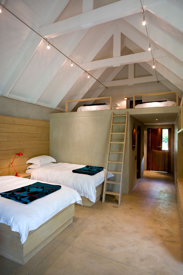 The family has three boys who have been bundled together in a cool, country dormitory setting with a large three-person shower next door. Downstairs a “dungeon” playroom is simply adorned with large family photographs.