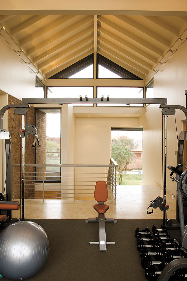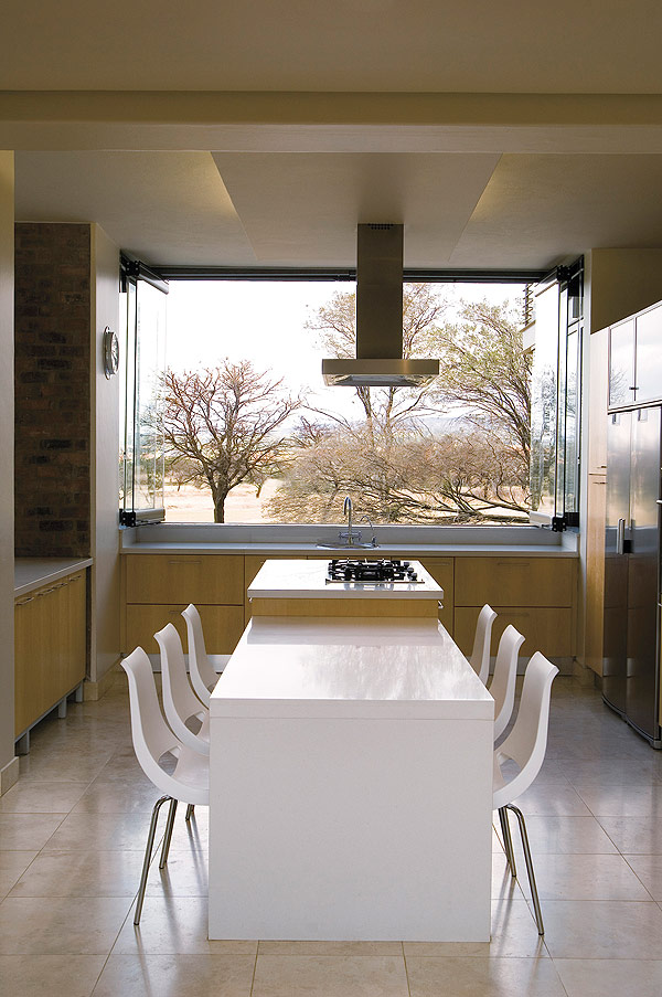 Transforming a comfortable living room into a summer veranda is as easy as opening a window, and even at the kitchen table you feel as though you’re alfresco. In the breezy top-floor gymnasium you exercise, cooled by the breeze. The main bedroom next door enjoys a 180-degree panoramic view of the dam and golf course – when you slide open the glass doors you can hear the ducks and on a summer night, if you sleep with the room completely open, you might be woken in the morning by the roar of the lions at the nearby Farm Inn.