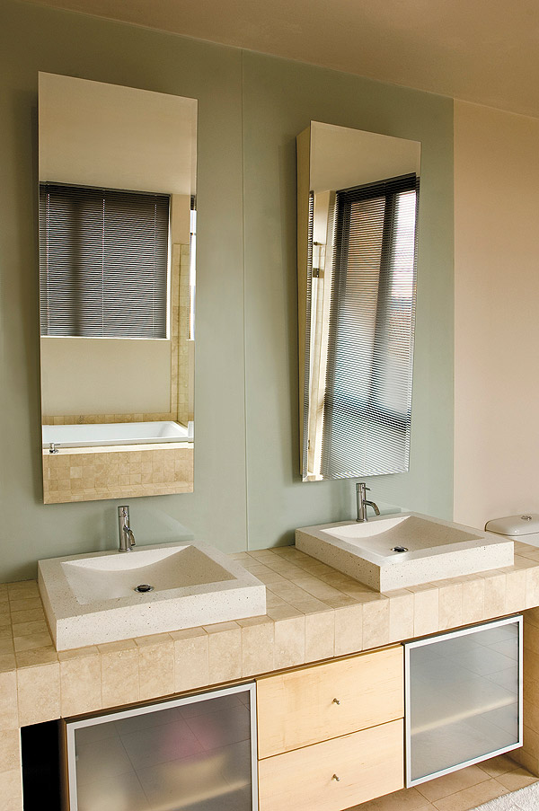 Another foot-friendly feature is the natural texture of the travertine tiles that have been laid through the house. Travertine has something of the gloss of marble but not its chilly grandeur. The architect has deliberately avoided playing with contrast here – floors, walls and ceilings are all more or less the same colour for a seamless effect. The travertine, together with russet-coloured brick, ensures that this house of glass and steel does not have an austere modern feel.