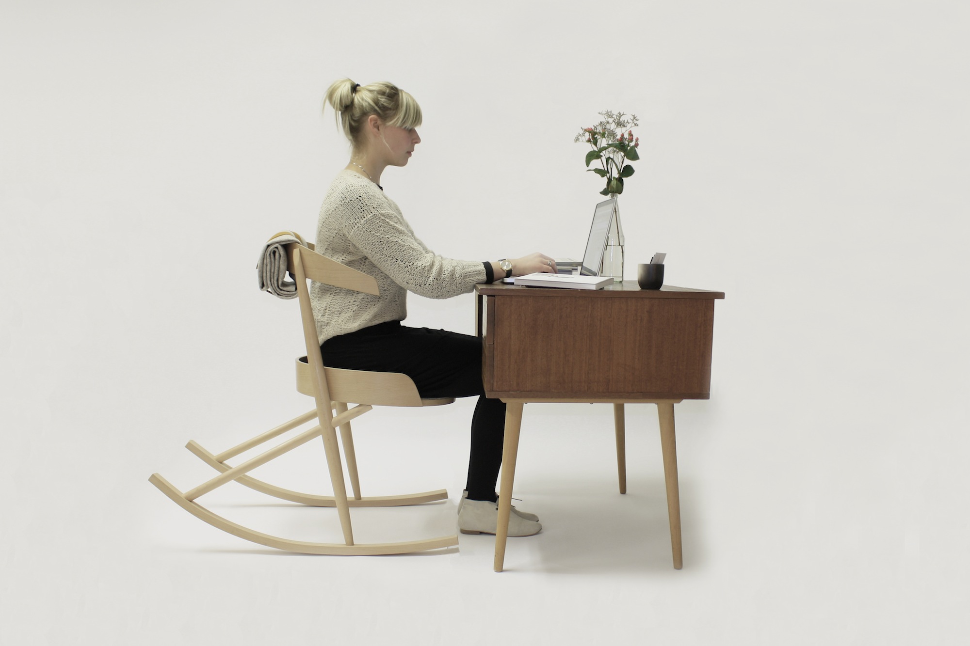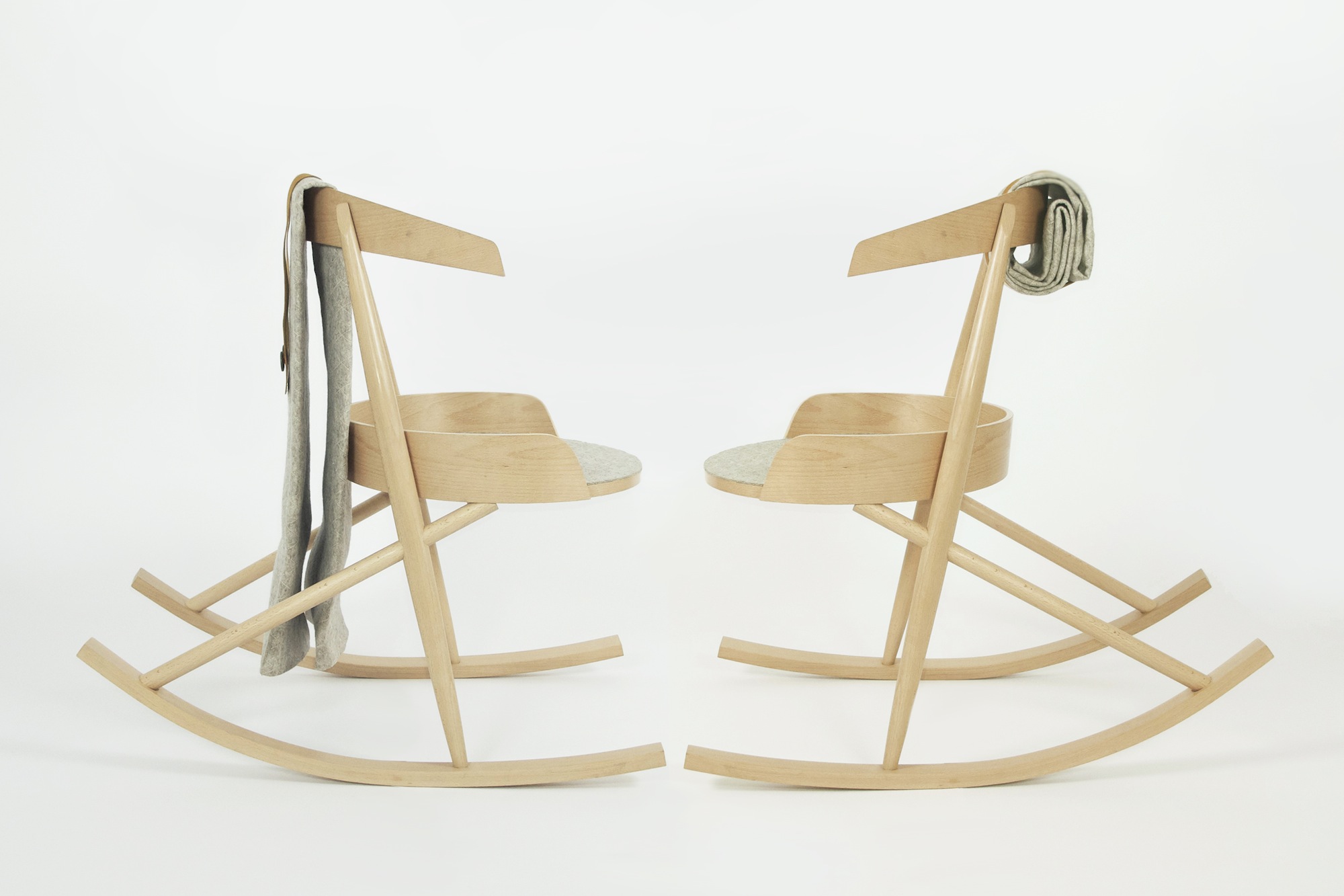 HUMMINGBIRD is a contemporary take on a classic rocking chair. The name reflects the calm state of suspension between being engaged and deep relaxation. When seated, the user is upright and alert, with a gentle tilt and shifting of weight, the chair creates an embracing sensation, producing the feeling of calm.