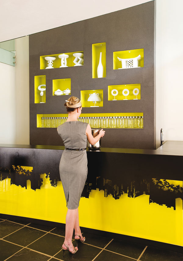 The cut-out theme continues in the outdoor dining area, where you’ll find funky yellow laser-cut steel furniture from Alsalvador in Johannesburg. In the conference centre, guests are invited to store their valuables in a wall of smart laser-cut steel lockers created by Vera Cruz, also in Johannesburg.