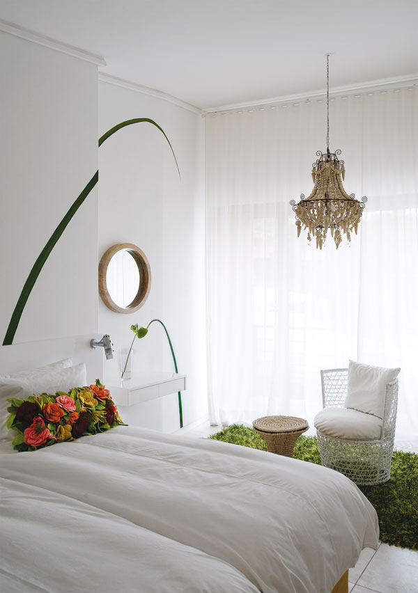 In the Nature Room, Ronel Jordaan surprises with a colourful floral pillow on each bed. Here, a Mud Studio clay chandelier is the perfect foil for the oversized green grass blades painted onto the wall.