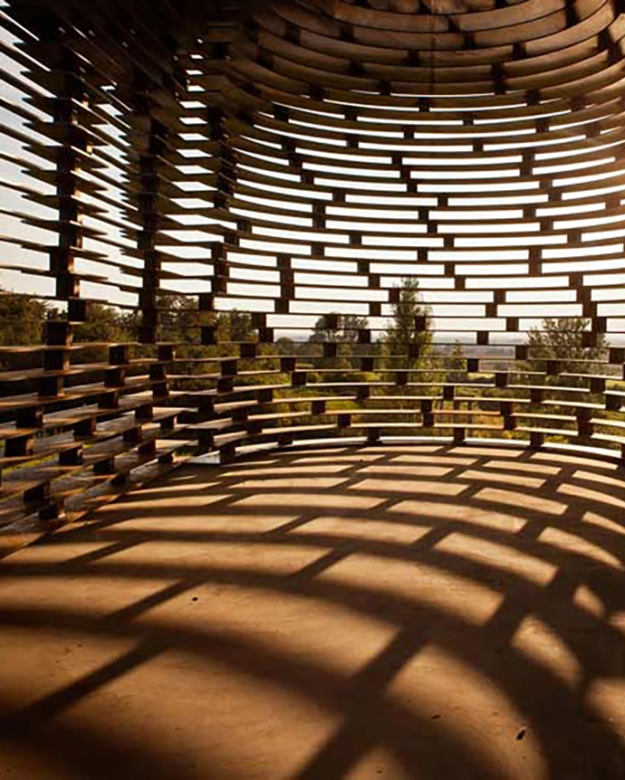 The 10-metre high church is made of 100 layers and 2,000 columns of steel. Depending on the perspective of the viewer, the church is either perceived as a massive building or seems to disappear – partly or entirely – into the landscape. Conversely – looking at the landscape from within the church – the surrounding countryside is redefined by abstract lines.
