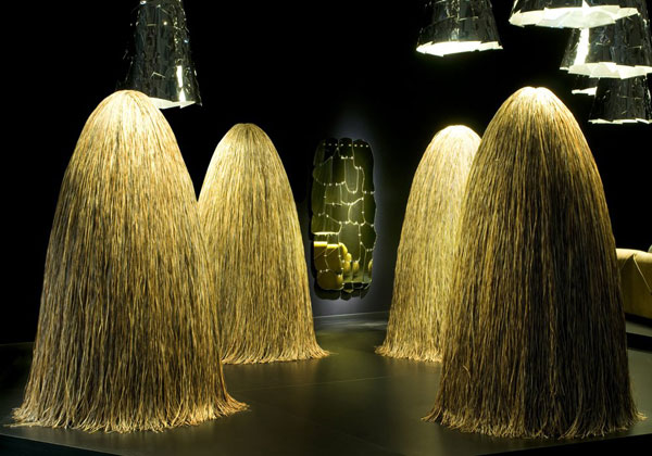 Alongside these pieces sits the eclectic Cabana storage unit: a simplistic, yet clever aluminum structure that features dangling lengths of raffia.