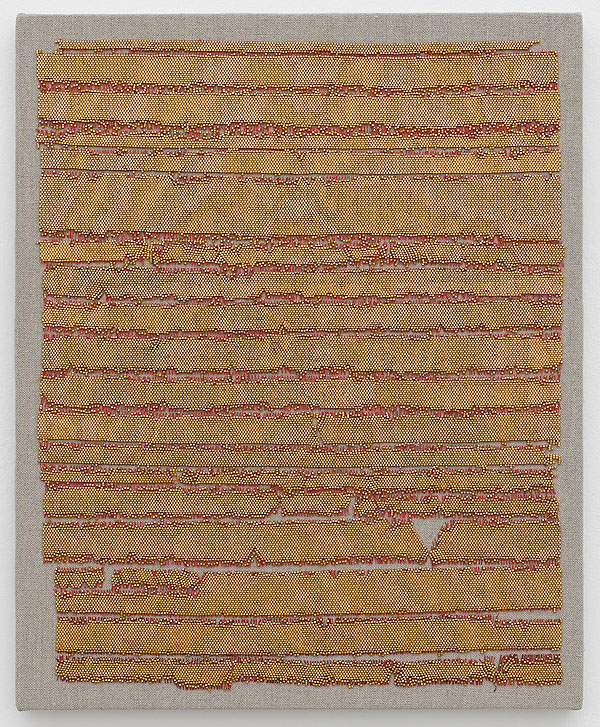 The latest work, at the White Cube, is less impressive but not any less fascinating. This work is much smaller and rather abstract. She calls it ‘a group of shimmering meditations on time, labour and the pleasures and ambiguities of looking’. The mindfulness and intense focus that beading requires is evident and thus gives the work a captivating feel. Some of the work seems to discharge a meditative calm into the upstairs of the White Cube on Hoxton Square, and it is in this stillness that the labour and craftsmanship really comes alive.