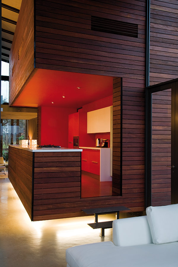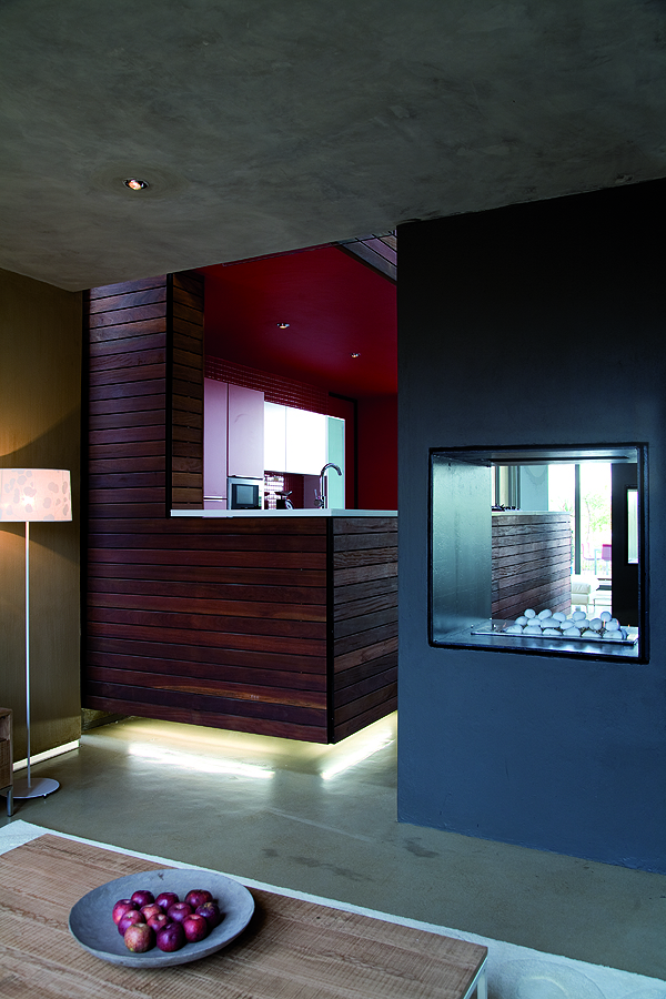 Al dié aardse skakerings en wye oop spasies sou maklik eentonig kon word as Thomas nie gekies het om ’n prettige element in te bring met ’n helderrooi kombuis wat lyk asof dit in die middel van die leef- en onthaalgedeelte sweef nie. Die kombuis, wat ontwerp is deur Thomas se vrou, Sureen (sy is aan die stuur van die binnenshuise deel van die onderne-ming), is deur Lifestyle Projects gebou, terwyl die rooi epoksivloer deur Industrial Flooring Systems voltooi is.