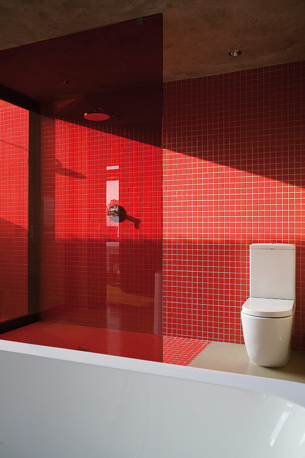 Spatsels rooi vrolik ook die badkamers op, waar rooigeteëlde storte met rooi glasmure deur Whipco sorg vir sensuele weelde. Al twee storte in die hoofslaapka-mers loop uit na buite – soos by enige top-bosveldlodge.
