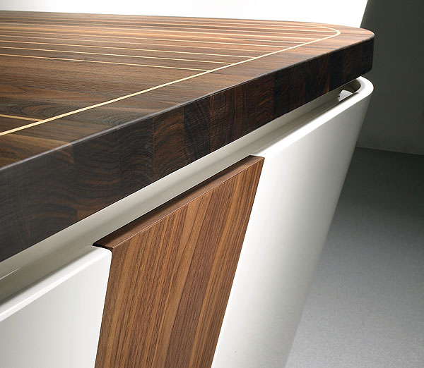 Besides it’s obvious boat-inspired shape, the Marecucina kitchen has many other elements that draw reference from the seafaring world. Mast and rigging, softly rounded precious walnut wood and delicate inlays create a distinctive contrast to the polished chrome fittings which together create an exclusive, nautical aura.