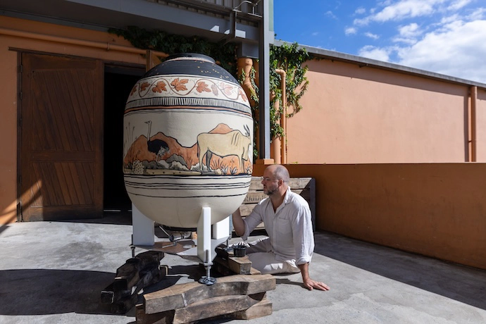 Michael’s chosen canvas for the initiative was a ceramic wine egg – itself an object of design and innovation. Within Graham Beck’s cellar, these eggs serve as fermentation vessels prized for their purity of form and function. Their smooth curvature encourages a natural circulation of wine, while the porous ceramic allows gentle oxygen exchange.
