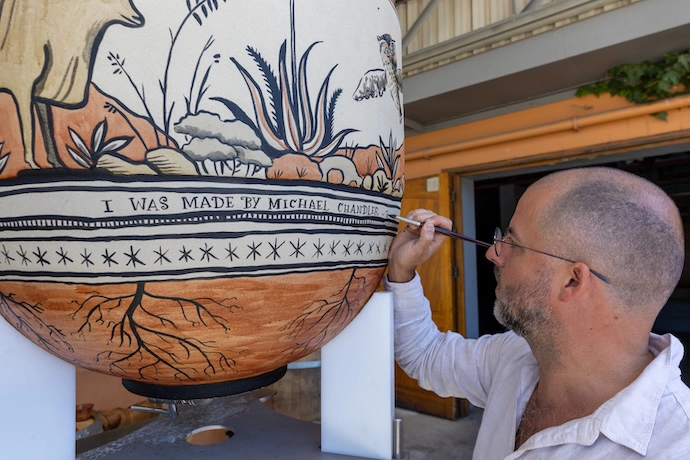 The first chapter in this ongoing series welcomed celebrated multidisciplinary artist Michael Chandler, whose work is well known for its sensitivity to craft, history and materiality. Following his previous collaboration with Graham Beck, the artist returned to the Robertson estate to create a singular piece: a hand-painted ceramic wine egg, realised over three days in the heart of the vineyards.