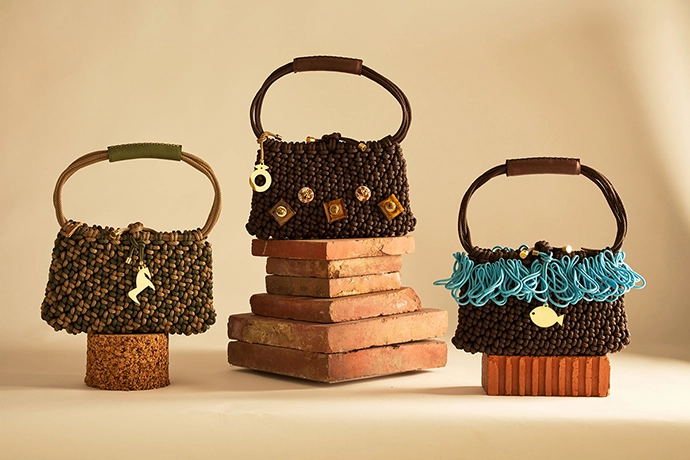 At the heart of the installation is a series of limited-edition embellished bags by PICHULIK. Each is a carrier of meaning, incorporating semi-precious stones, sculptural rope, and symbolic cast brass to evoke ancient ideas of value and adornment.