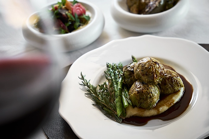 On the plate, dishes champion produce from the estate and its surrounds – think traditional werf chicken pie scented with fynbos; nostalgic Merino lamb frikkadelle; and carefully composed bites that let farm-picked vegetables shine. On Sundays, Geuwels extends its farm-led philosophy with harvest lunches served family-style –generous, seasonal feasts designed for convivial gathering and shared at the table, in keeping with the estate’s warm, communal spirit.