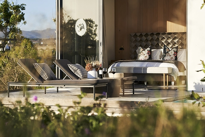 Among the estate’s accommodation offerings are the four vineyard suites which serve as private retreats, combining sweeping vineyard and mountain views with refined, contemporary luxury. Set just a short stroll from the historic 1773 homestead, the suites pays homage to the estate’s Cape Dutch heritage, echoing the whitewashed clay-and-lime walls of the original homestead, while contemporary lines and modern finishes bring them firmly into the present. Inside, the design is quietly sophisticated – a considered blend of clean-lined furnishings, natural textures and warm, earthy tones that reflect the surrounding landscape.