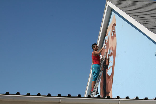 Indigo from Canada and David Shillinglaw from the United Kingdom have been hard at work these past few days. David is busy with a mural inside the lounge of the home that incorporates the names of the boys who stay at Percy Bartley’s, while Indigo is transforming the roof of the home with a portrait of the eldest and most respected resident, Grant Adams.