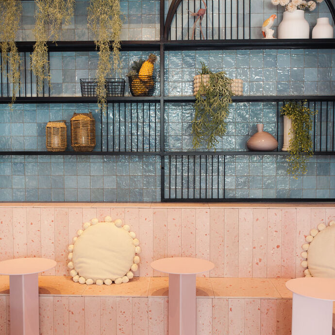 The result is a space that is both calming and totally Instagrammable. “For the first time we introduced both brand colours,” Andrew elaborates. “The soft, sweet hues of pink and vibrant teal are an antidote to the stresses of modern-day life. The light and bright palette embodies the South Africa summer, reflecting the brand’s casual personality through the creation of a warm and inviting space.”