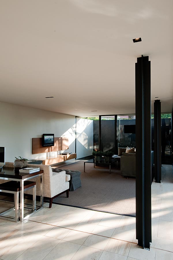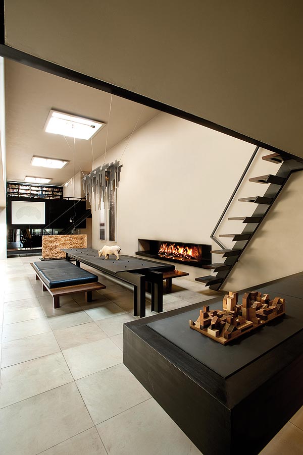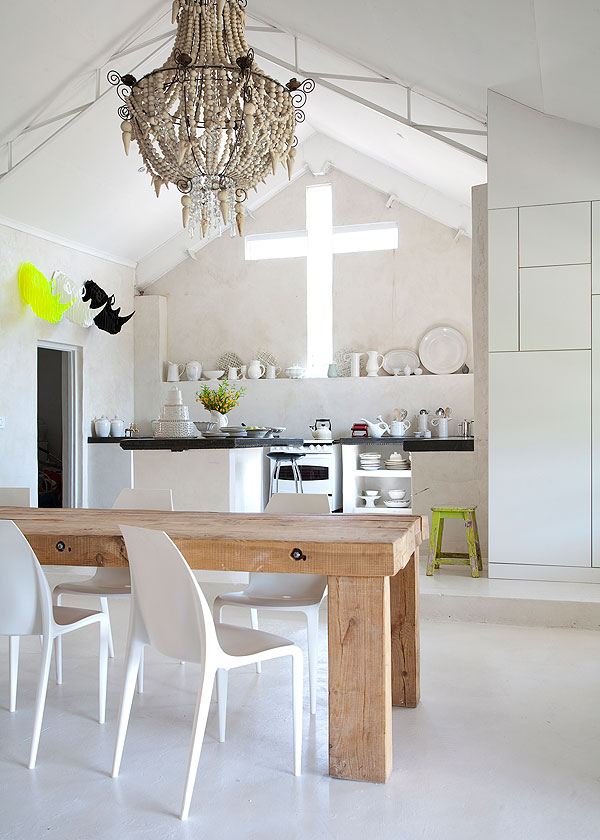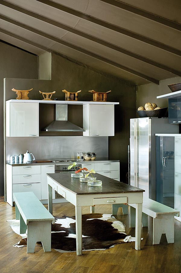 Consider painting concrete floors with several coats of hard-wearing white road paint, which will reflect natural light and create a luminous glow throughout your living space. Leather furniture and wood are durable and add contrast, while Persian carpets work well aesthetically when slightly worn.