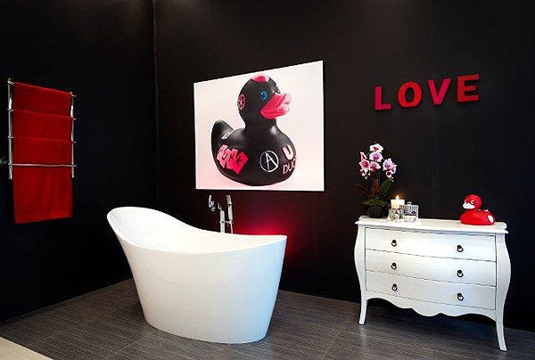 Personalise the space by adding a couple of ornamental pieces. An over-sized duck poster, made from a blown-up photograph, breaks the black wall and adds interest to the bathroom pictured above. The curvy white enamelled Louis XVl-inspired reproduction dresser adds a feminine touch and provides added storage space, as well as a surface for flowers and other ornaments.