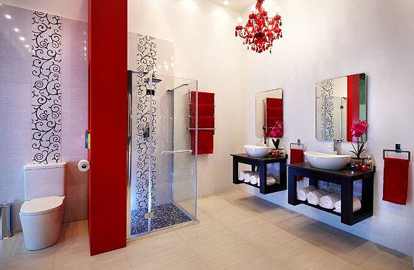 Changing the colour of the wall, towels and accessories provides an easy opportunity to change the entire look of the room. Here, the red colour is echoed in the striking chandelier.