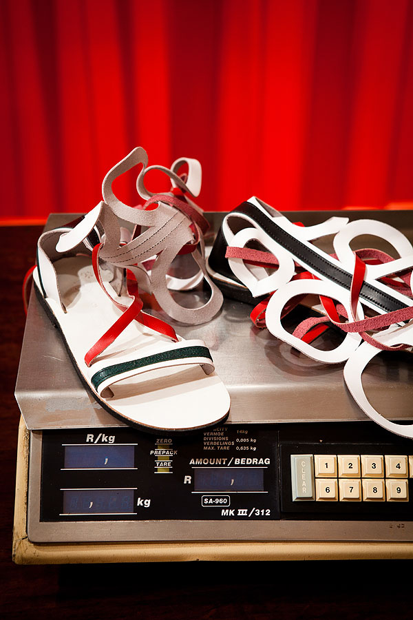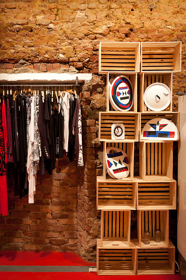 Exposed brick walls, a red floor and a row of hanging lights highlight the vintage fridges, shopping carts and Coca-Cola crates that display the fashion items. “This is a delicatessen of fashion,” says Thulare. “I spent about three weeks looking in second-hand catering stores and such to find items that reflected a deli space, and then the challenge of translating these items for a new purpose began.”