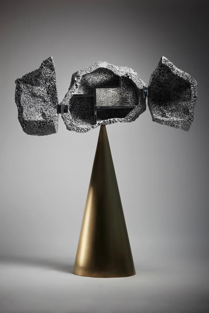 In a project for Pearl Lam Galleries, Azusa and Alexander created foamed aluminium by injecting a gassing agent when molten, resulting in a lightweight material that has the appearance of pumice (which undergoes a similar process within volcanoes). “Metallic Geology” was inspired by the tradition of Chinese rock gardens and draws striking contrasts between the power of nature and the still sanctuary. The pieces appear to defy gravity.