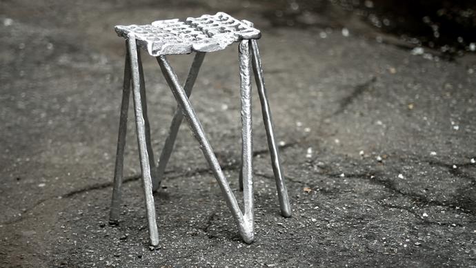 “Can City”, one of the studio’s earliest projects, is a collection of aluminium objects made from waste on the streets of São Paulo that looks at waste in big cities. A mobile foundry was created from salvaged materials to melt aluminium cans using waste vegetable oil collected from local cafés as a fuel. Studio Swine made stools for the food vendor that provided the waste cans and oil. Manufactured on the spot, each piece is unique and expressive. Waste is transformed into metal objects that provide a portrait of the street.