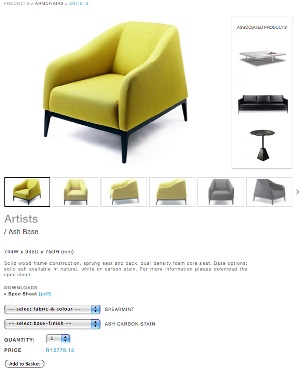 Even if you prefer to buy via the showroom, the user-friendly site offers a great browsing experience. You can customize your pick by choosing the material, fabric and colours, after which the price of your purchase is calculted and displayed immediately. Once you’ve made your purchase, the transport, packaging and insurance is looked after by Stuttaford VanLines.
