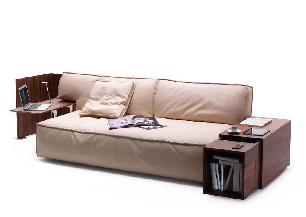 “MyWorld is a cocoon, a nest, a world where we can be egocentric and comfortably commune with our own shadow or collect snippets of news from the world that is said to be real,” says Philippe about the collection. The two and three-seater sofas, an armchair, chaise longue and ottoman, can be decked out with tech-equipped accessories that include a side table with electric sockets, USB charger, induction charger and smartphone receiver.