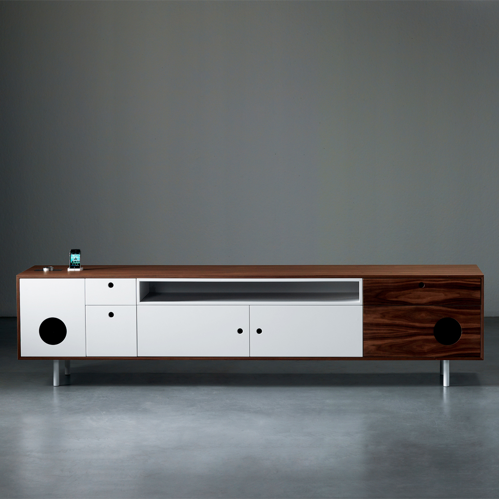 Available in white, red or black lacquer or canaletto walnut, or a combination, this entertainment table comes with a universal iPod dock and Bluetooth-integrated stereo system. Connect your TV, computer, iPod and more.