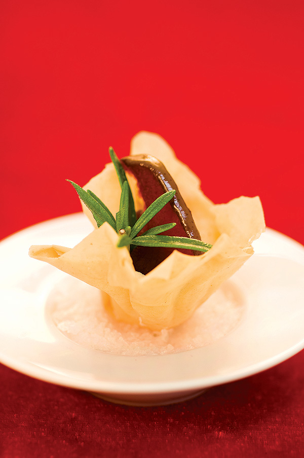 2. Garnish each with deep-fried sage and pomegranate rubies.