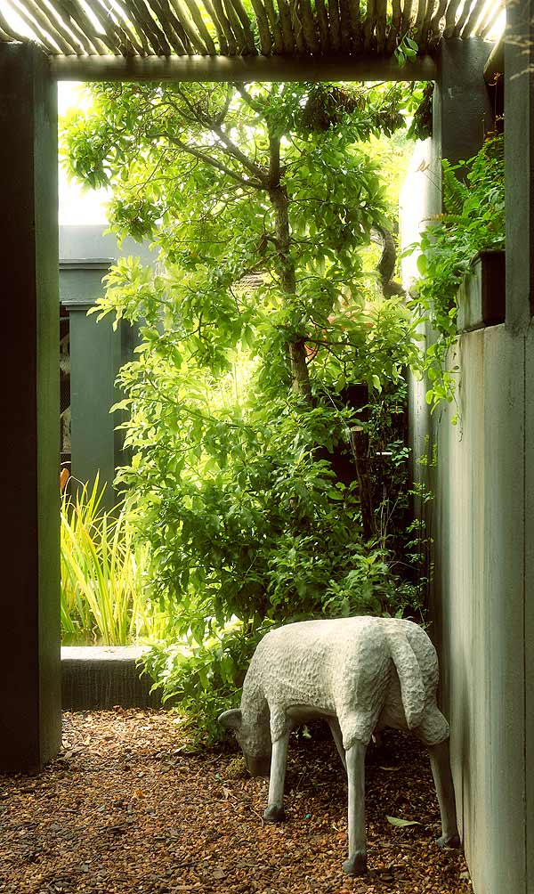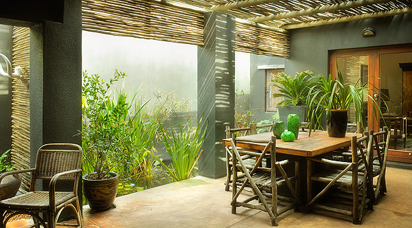 Oral in die tuin het hy terracottapotte gesit met varings, roosmaryn en malvas. Twee visdammetjies sorg vir fokuspunte in die binnehof en op die stoep – die ruimte kry as ’t ware ’n tropiese gevoel. Pergolas van watteltakke sorg vir privaatheid en koelte vir buite- en aangrensende binneruimtes, en dit help om die buiteruimtes as vertrekke te definieer.
