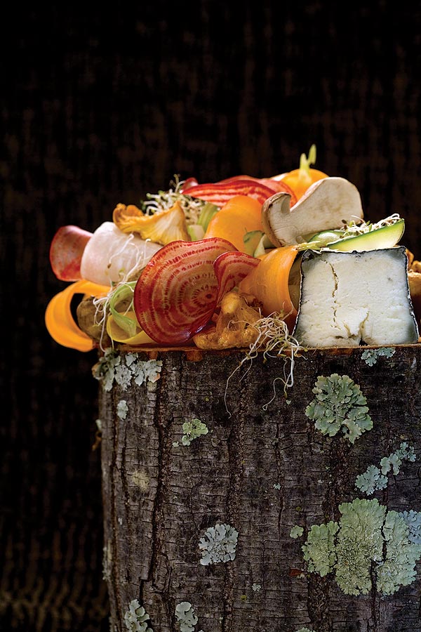 Peel and shave 2 carrots, 2 beetroots and 1 daikon (Oriental) radish. Place the vegetable shavings in cold water to make them curl. Drain and add 100g shaved fresh porcini mushrooms, or any other mushroom shavings. Dress 6 vegetable-ash goats’ cheeses or crottins with extra-virgin olive oil and 60ml fresh herbs, chopped. Warm the goats’ cheeses on a baking tray in a preheated oven for 4-5 minutes (180°C). Drizzle extra-virgin olive oil over the vegetables and season with Maldon salt. Garnish the dish with alfalfa sprouts and serve with crusty bread.
