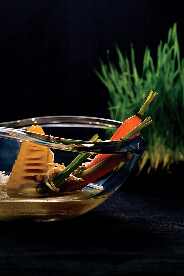 Heat 1,2 litres of water with 50ml red miso paste, 50ml fish sauce and 3cm fresh ginger, thinly sliced. Add 50ml dried fish flakes and 1 stem of chopped lemon grass. Remove from the heat and allow the sediment to settle at the bottom. Carefully pour off the clear liquid on top, or pour it through a muslin cloth, to create a clear broth. Add young seasonal vegetables, bamboo shoots, water chestnuts and oriental mushrooms. Add fresh shredded wheatgrass just before serving.