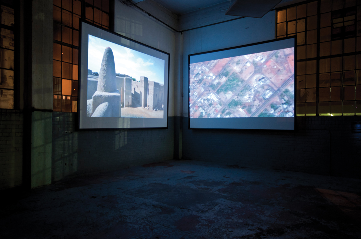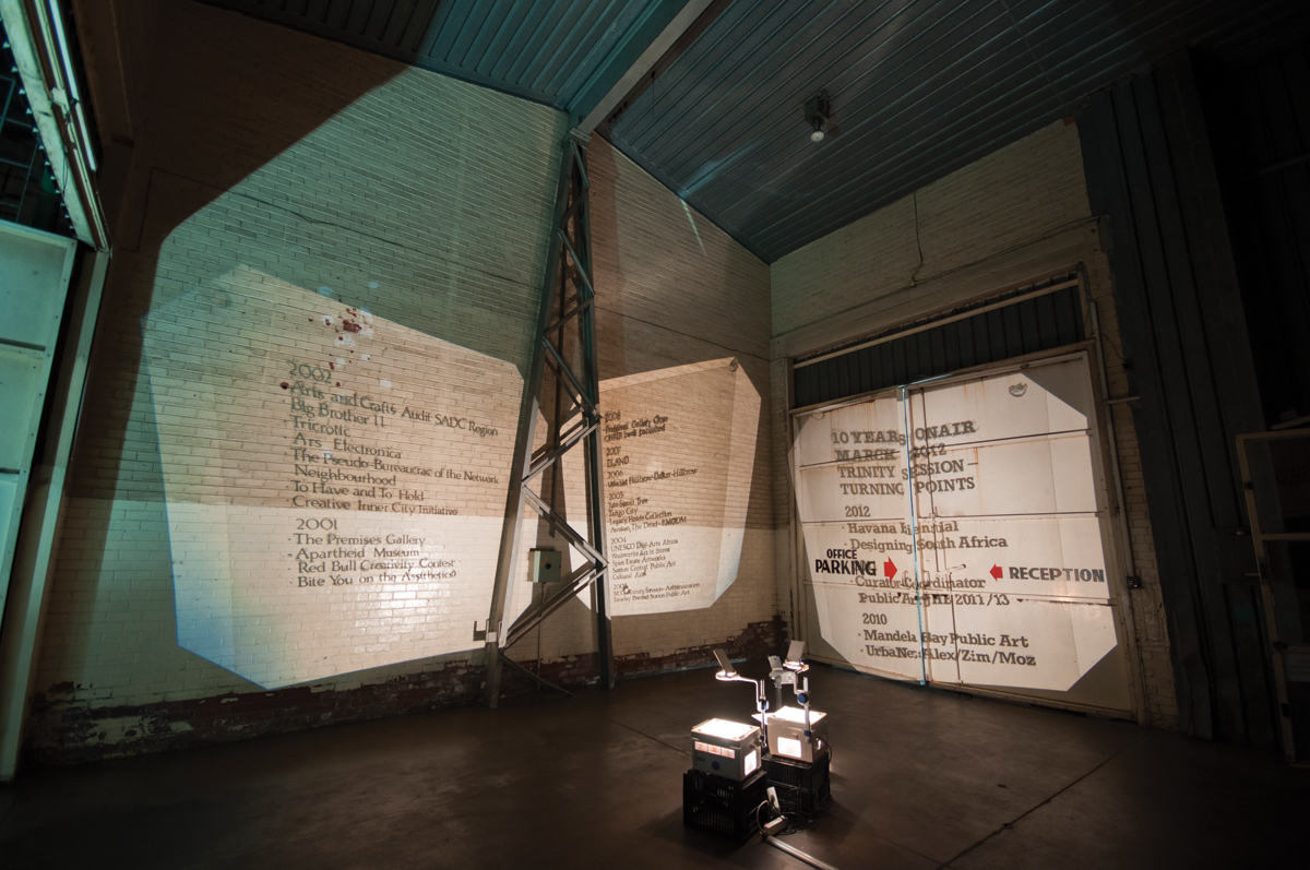 It seemed appropriate then that the Trinity Sessions have inaugurated the latest jewel in the Maboneng crown with a retrospective exhibition of unprecedented scale. Stephen Hobbs and Marcus Neustetter have extended an investigation into social and electronic networks and varied urban terrains. As much of their work is experiential and ephemeral in form, the unique venue currently plays host to an exhibition made up of light. Video, photography, mind maps and artifacts from a dense archive of research will be transformed onto large projection surfaces.