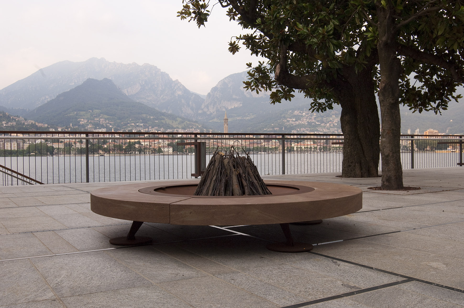 Rondo is a wood fireplace for outdoor use with supporting structure in steel and round Santafiora trachyte stone sitting. The natural elements of fire and stone are combined together with a modern design, thanks to technology and craftsmanship. A sculpturesque furnishing element, Rondo lives in every outdoor situation where an important stage presence is required. It is also provided with a closing disk and a grill kit, and the natural chromatic variations of stone are a guarantee of uniqueness.