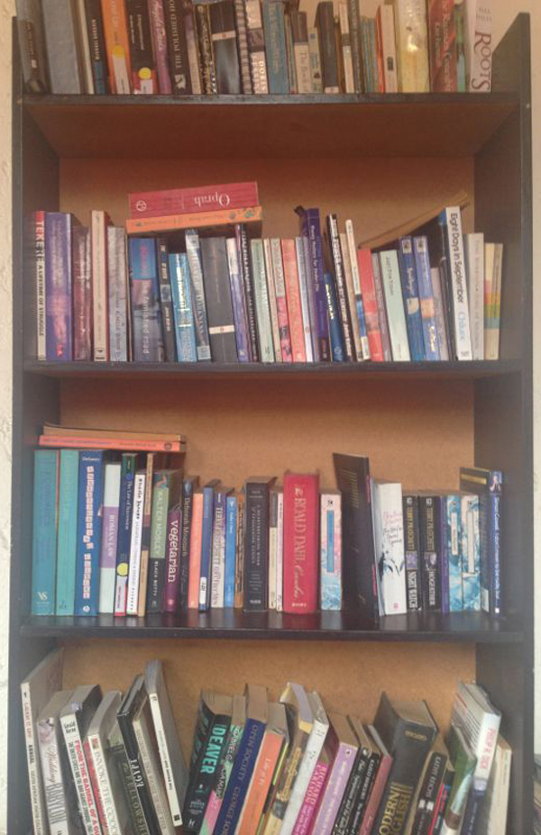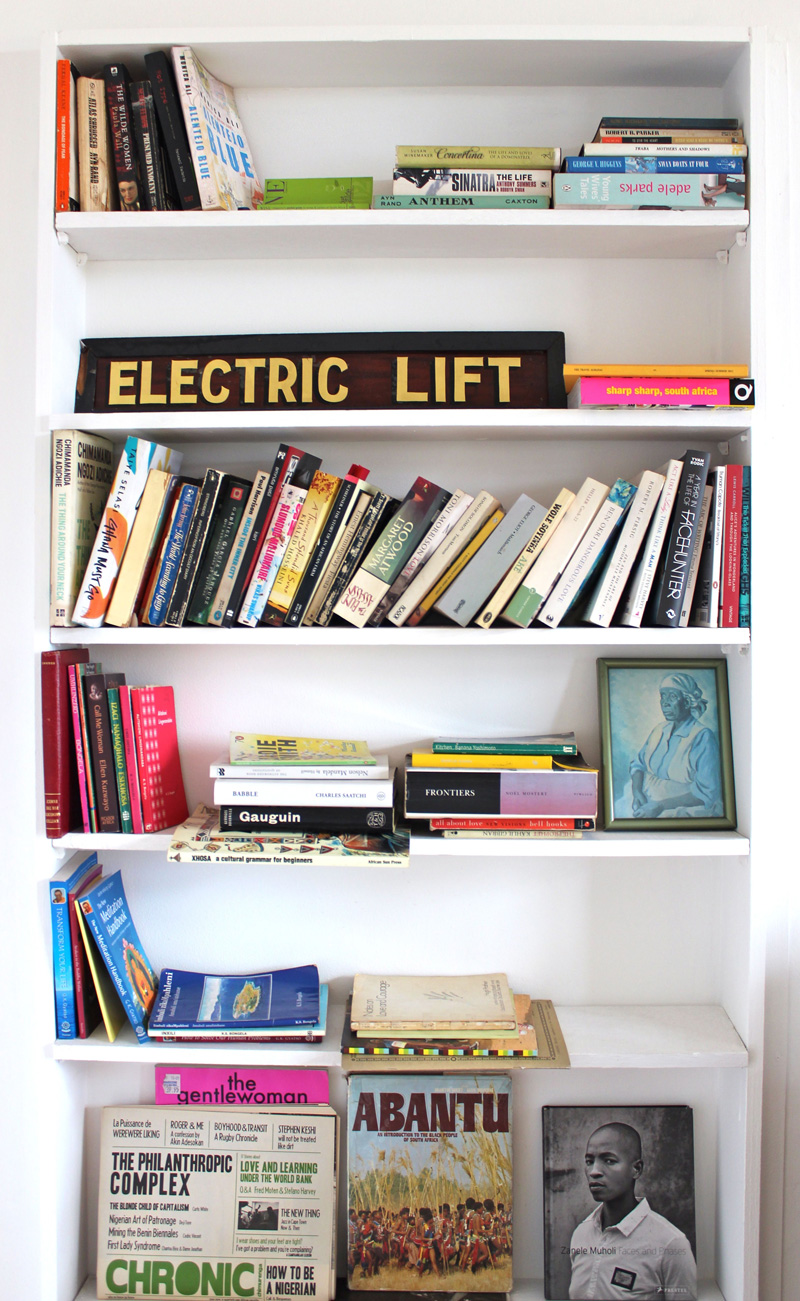I don’t have as impressive a bookshelf as I would like, but it’s growing slowly and I’ve read all the books on it. My bookshelf came with my place; it’s embedded in the wall. My favourite place to read is in bed, when I wake up or just before I go to sleep. Three of my favourite books on my shelf are Frontiers: The Epic Creation of South Africa and the Tragedy of the Xhosa People by Noel Mostert – I call it the book that woke me up, Half of a Yellow Sun by Chimamanda Ngozi Adichie – the book that encouraged me to tell stories, and The Prophet by Khalil Gibran – the book I live by.