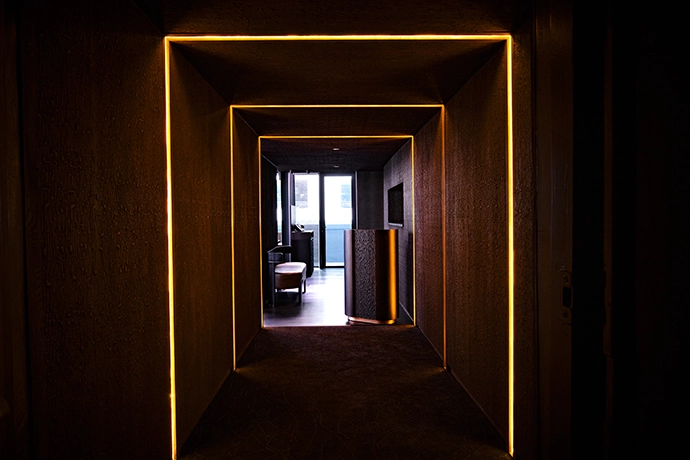A ribbon of soft LED light runs along the panels of the arrival hall, casting a warm golden glow that draws you forward, heightening the anticipation as you enter the dining room.