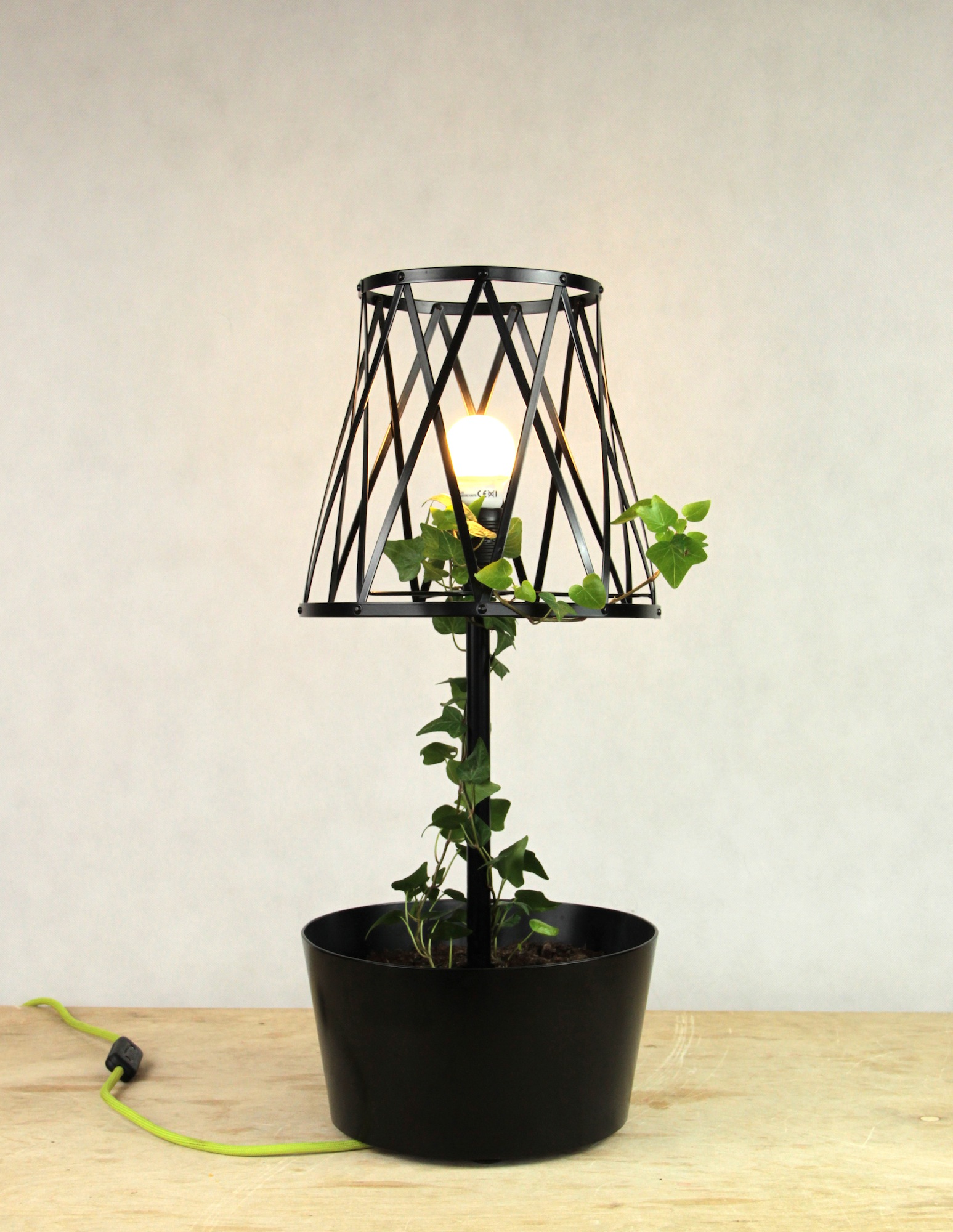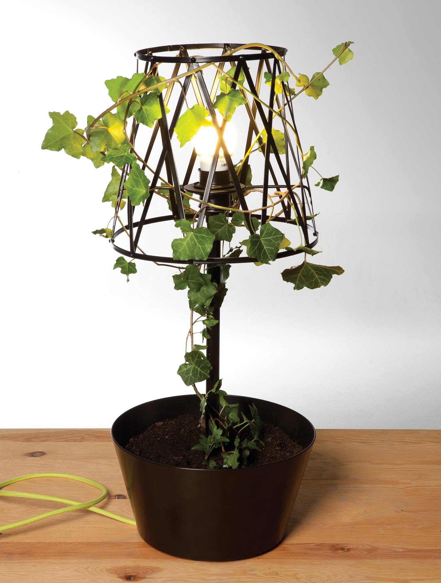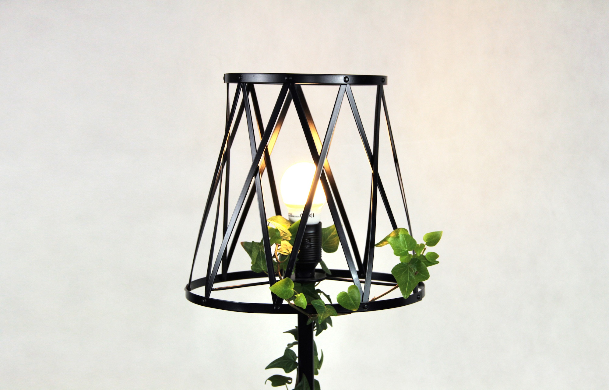 The base of the lamp is a plant pot, and the shade is made of a plant sprouting over an openwork grid. Lamplight sifting between the plant’s leaves produces lighting effects resembling the sun beams shining through the leaves. As a result, the interior in which the lamp is placed is filled with play of light and shadow that changes depending on the shape and height of the plant. The metal lamp is simple and industrial, contrasting beautifully with the organic form of the plant.
