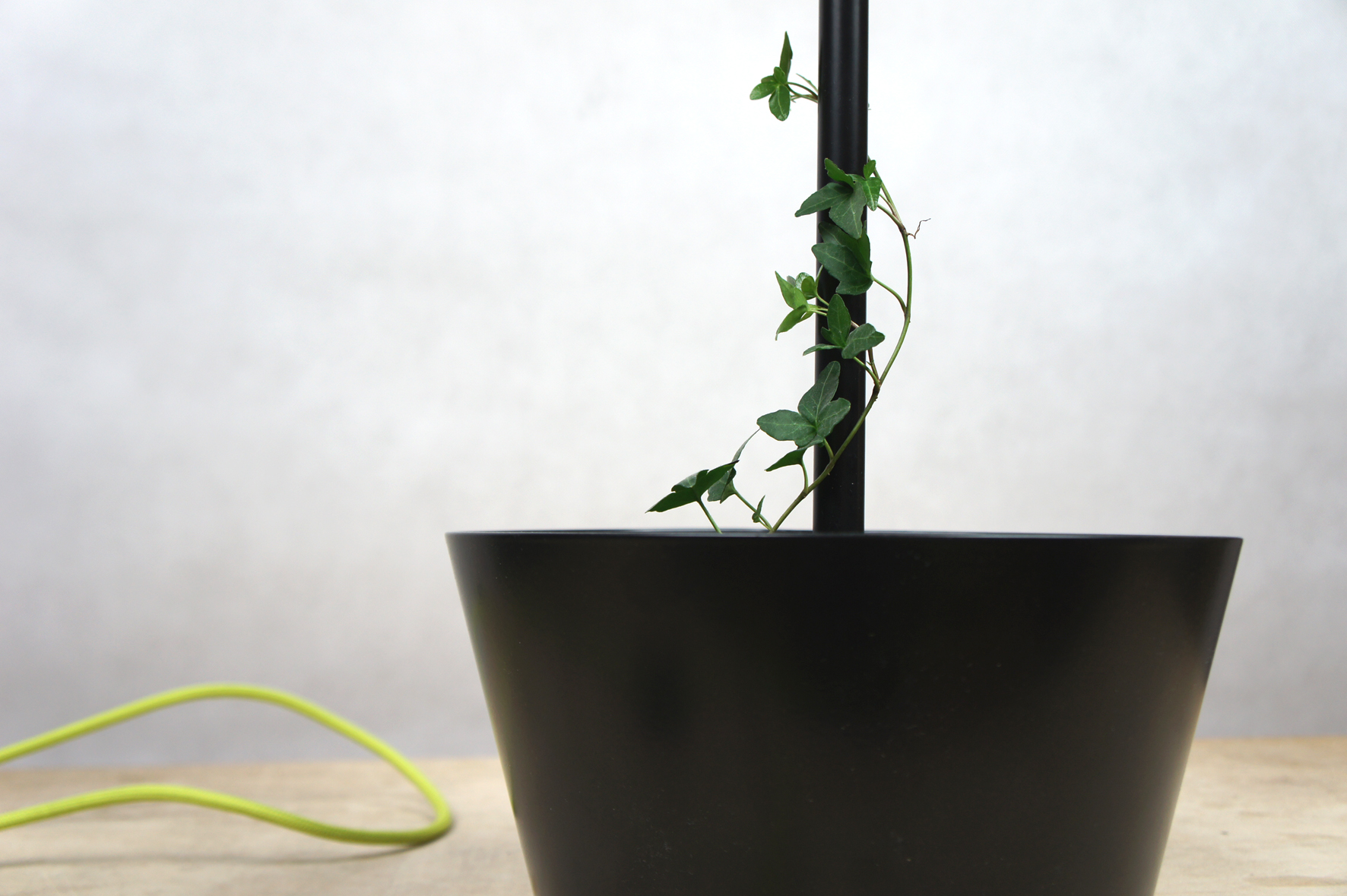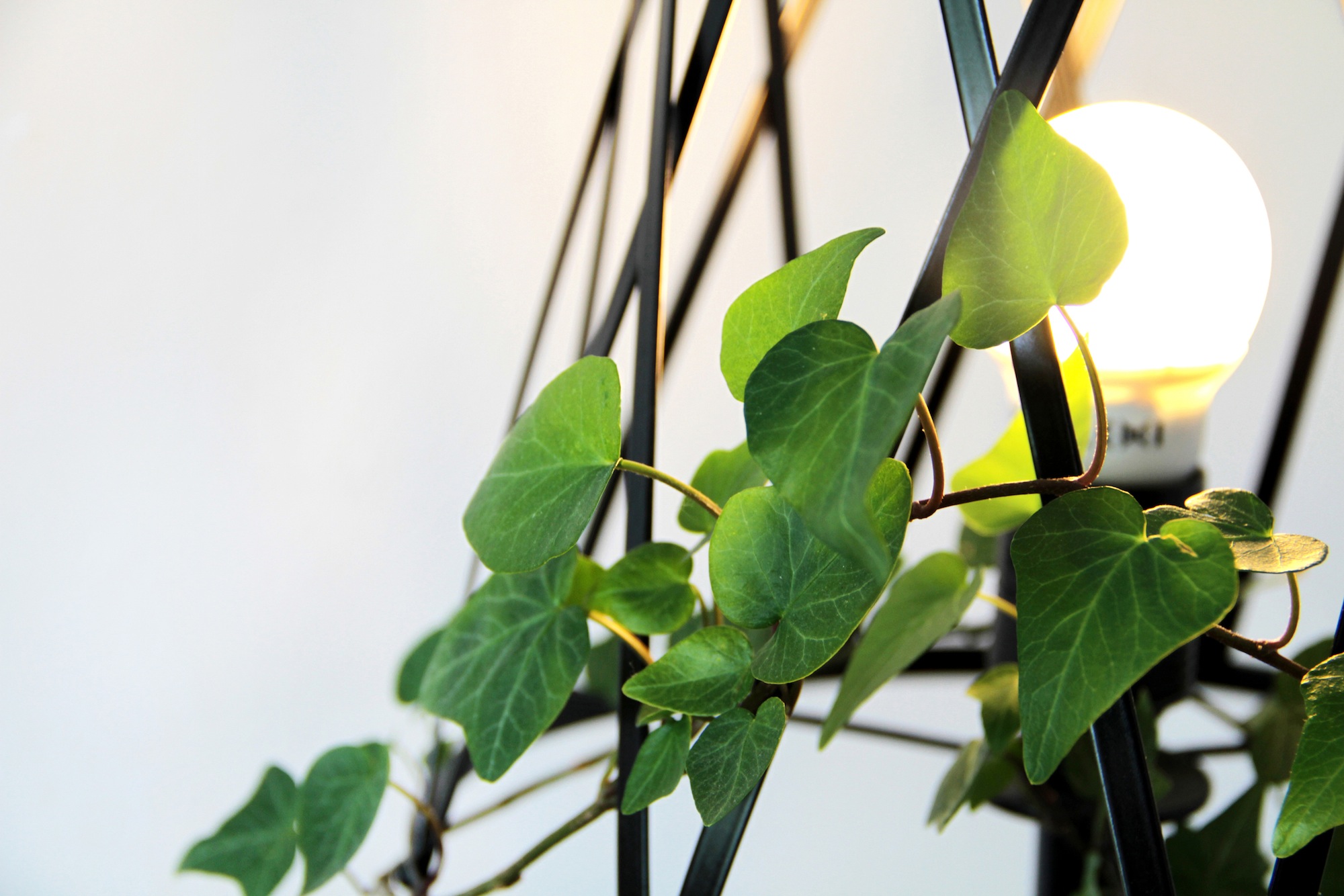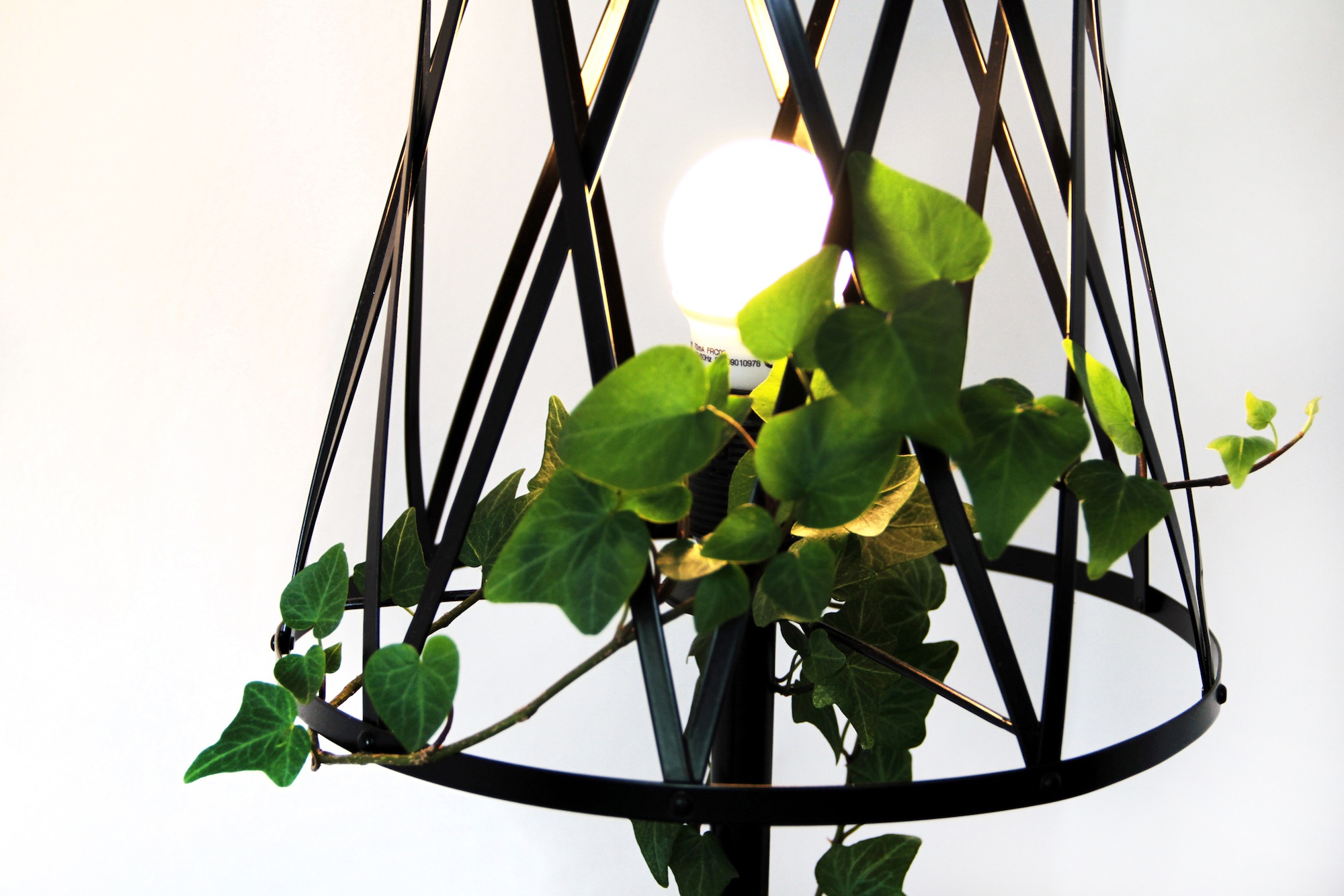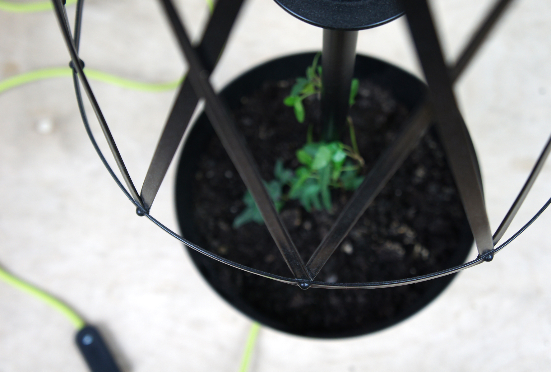 The base of the lamp is a plant pot, and the shade is made of a plant sprouting over an openwork grid. Lamplight sifting between the plant’s leaves produces lighting effects resembling the sun beams shining through the leaves. As a result, the interior in which the lamp is placed is filled with play of light and shadow that changes depending on the shape and height of the plant. The metal lamp is simple and industrial, contrasting beautifully with the organic form of the plant.