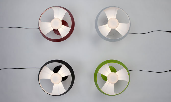 The fun and games in the nursery doesn’t have to stop at furniture and accessories. With colour and playfulness, your lighting can add another dimension to the kid’s room. Seen here are Muuto hanging lights in grey, red, black, white and blue, and a La Voliere birdcage table lamp.