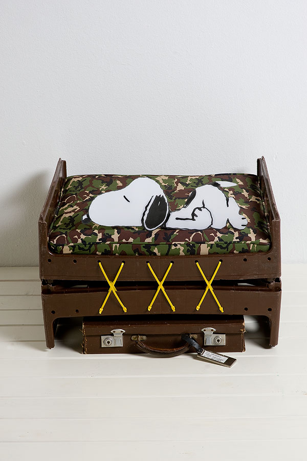 Keep it simple and comfy. Fix two crates together, base to base, with the extra-long cable ties. Measure the dimensions and have a cushion made from your chosen fabric. Slide the weekend case underneath and let Snoopy make himself at home.