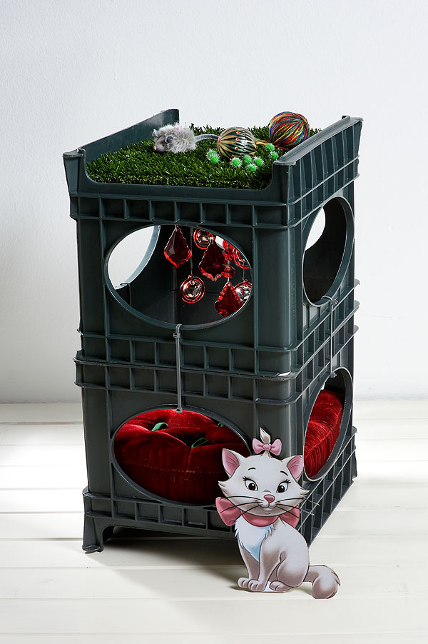 Go for glam! Place the velvet cushion in the bottom crate and fix the two crates together, open end to open end, with medium-length cable ties.Attach the crystals to the grid-like base of the top crate (Annemarie used the metal rings that attached her crystals to the original chandelier), cut the Duraturf to fit the “roof” (its rubber base keeps it in place), and voilà, Marie has her dream boudoir.