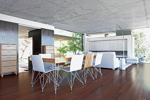 One of the house’s most striking features is its system of sliding glazed doors, timber shutters and panels that allow the owners to continuously recreate their space. They are able to adjust the interior according to their needs for light, ventilation and privacy, as well as alter the façade to create either a public or more private residence depending on their mood. On a perfect day the house is completely open to the mountains and city, but when the infamous southeaster roars – they can quite literally batten down the hatches for a more intimate environment.