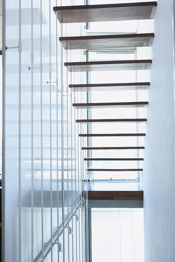 To counteract this, the bulk of the house was positioned along the front edge of the plot in the form of three linear structures stacked on top of each other – the living level in the centre, with the main bedroom suite above it and the guest room, guest bathroom and study at the bottom.