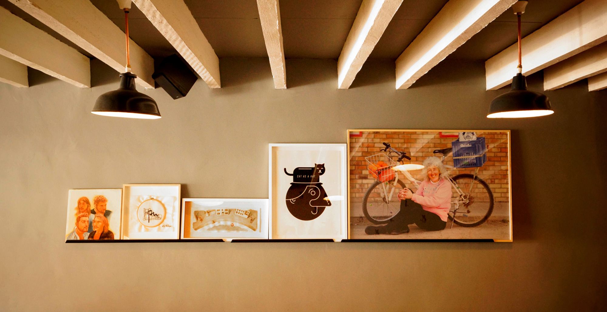 Angie and I both come from an ad agency background where we were constantly coming up with ideas for other people. Part of the job was knowing that your ideas will be watered down or rejected for being too “out there”. Now that we are our own clients we get to make those calls. So if we decide we want to design our own wallpaper featuring a repeat pattern of a cat in a top hat then we do it, or if we want to have a giant cat head outside, instead of a sign with our logo, then we do it. So it’s a combination of what the space needs and some weird ideas we thought would be fun.